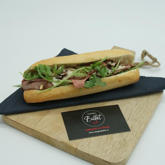 Broodje belegd met rosbief, truffelmayonaise, parmezaanse kaas, pijnboompitjes, en rucola sla