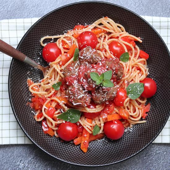 Spaghetti met gebraden gehaktballetjes in een kruidige Italiaanse tomatensaus met verse wokgroenten.