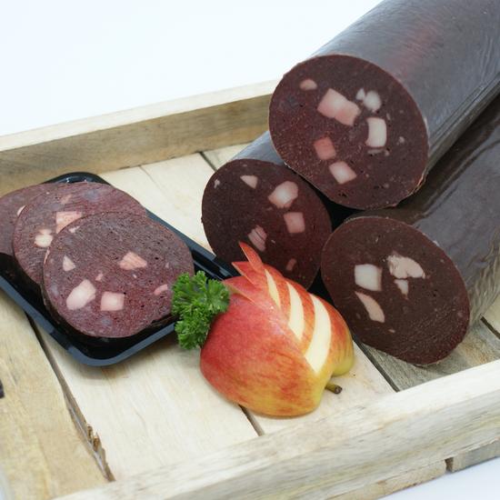 gegaard vark.kopvlees, zwarte peper, bouillon, varkens bloed, majoraan, speksnippers, aroma,s, kaneel, boekweimeel, dextrose, piment, kruidnagel, broodpaneer, uienpoeder, E450, sacharine, nitriet, E535, pepers, keukenzout, jalapeno peper en E300Bereidingsadvies