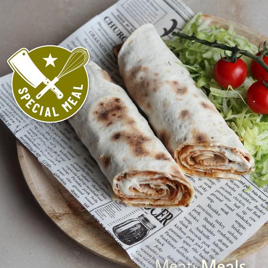 Een makkelijke en smakelijke maaltijd. Turkse pizza met kipgrillworst. lekker met ijsbergsla